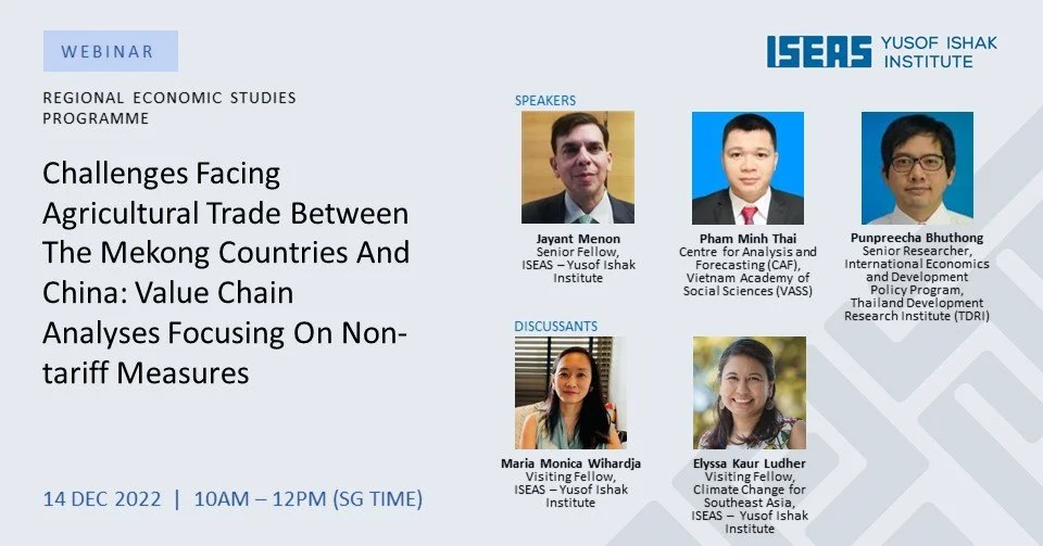 Against this backdrop, the webinar will discuss the findings from a recent ISEAS publication entitled Agricultural Trade between China and the Greater Mekong Subregion Countries: A Value Chain Analysis. The approach taken involves detailed case studies of key agricultural export commodities in the CLMV-T countries destined primarily for the Chinese market. The analyses seek to identify specific impediments along the value chain and the NTMs that interfere with cross-border trade. The webinar will provide an overview of all of the case studies and the policy issues that arise from them, and the detailed country case studies of Thailand (cassava and durian) and Vietnam (dragon fruit and coffee).