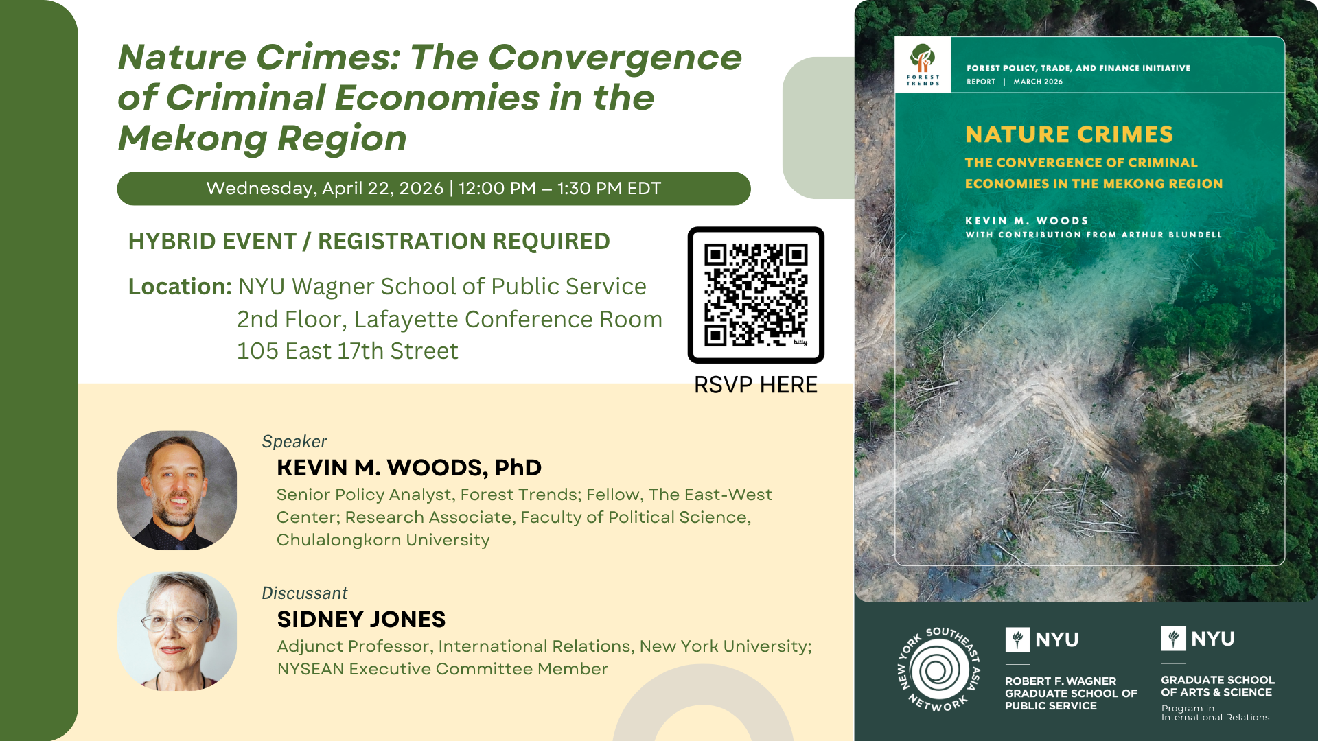 Join NYSEAN for a talk by Dr. Kevin M. Woods, senior policy analyst at Forest Trends, who will present the findings of a new report on how the Mekong Region—particularly the tri-border “Golden Triangle” of Myanmar, Laos and Thailand—has become a hub where environmental exploitation and criminal activity converge, collectively generating billions of dollars annually for transnational enterprises. The report, Nature Crimes: The Convergence of Criminal Economies in the Mekong Region, examines how the illegal extraction and trade of natural resources are deeply embedded within broader illicit economies across the Mekong Region, with particular focus on post-coup Myanmar. Sidney Jones, adjunct professor of International Relations at NYU and executive committee member of NYSEAN, will moderate the discussion.